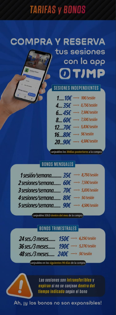 La metodología de pago está totalmente digitalizada a través de la App Timp, mediante la cual se gestionan totas las reservas y horarios entre otras herramientas disponibles.